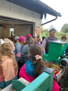 Am Dienstag, den 14. Oktober durfte die 4. Klasse der GS Marquartstein die Familie Weißenbacher besuchen, um beim Apfelmosten zu helfen. Es wurden die Äpfel gemostet, die zwei Mamas aus der vierten Klasse vorher gesammelt hatten. Herr Weißenbacher erklärte den Kindern die Funktionsweise der Apfelpresse und schon ging es los. Begeistert halfen die Kinder mit und verfolgten den Prozess des Mostens. Währenddessen konnten sie verschiedene Apfelsorten aus dem Garten von Familie Weißenbacher probieren.